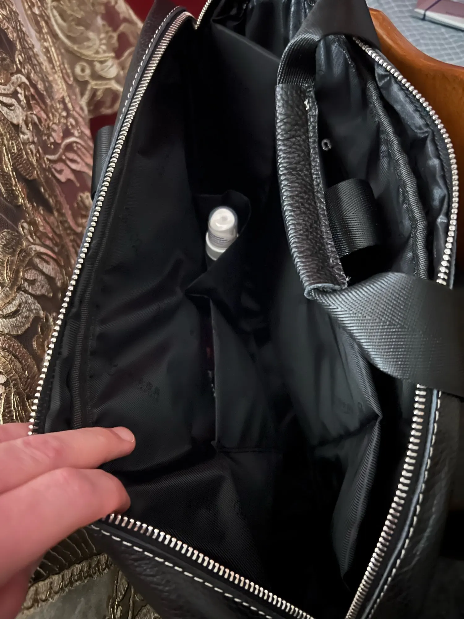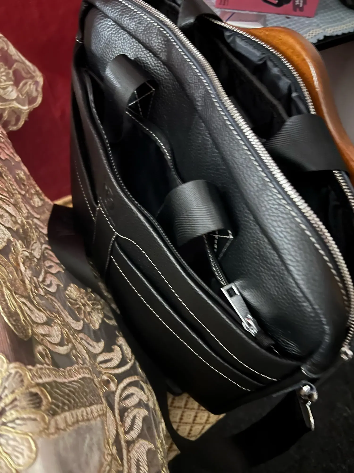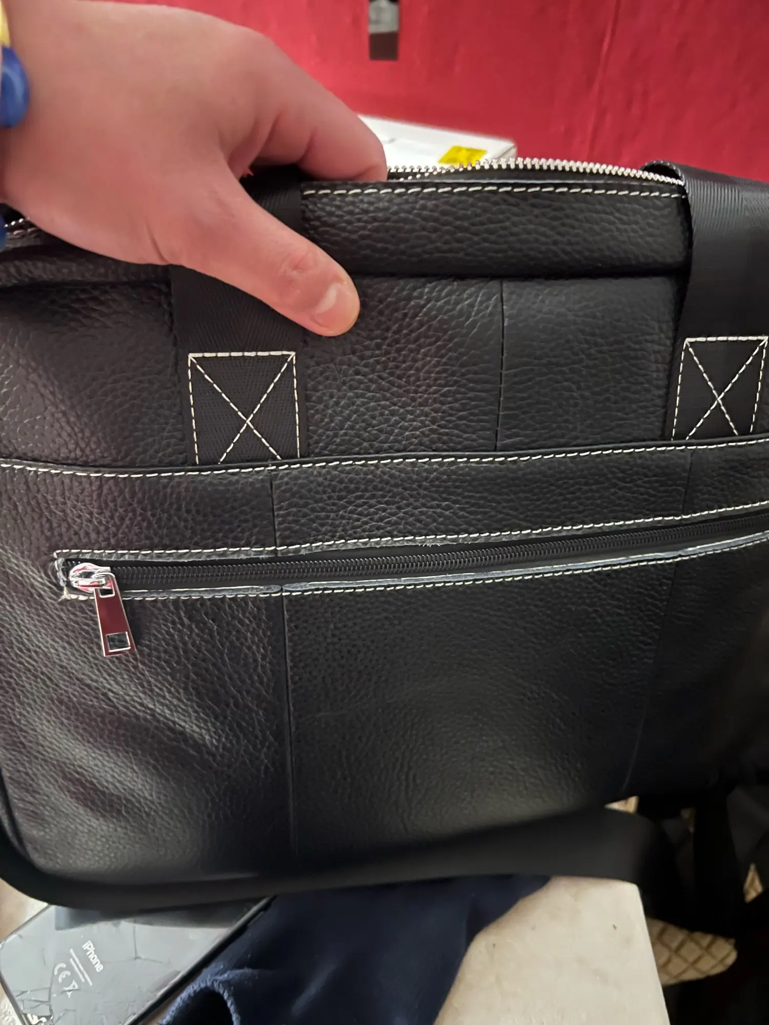 Jefferson Beahan The important part: real leather! An absolute bargain for this price, and i regret nothing. My only complaint is that i wish there were better laid out compartments for pens and such but i can probably just buy some organizers and keep them in the bag!